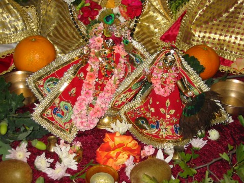 Der schön hergerichtete Tempelraum, der noch nicht ganz fertig ist, bietet Platz für zahlreiche Besucher. Was könnte schöner sein, als zu so einem Anlass His Holiness Bhakti-Caru Swami zu Gast zu haben. Auf dem zweiten Bild links von oben schmückt er Shrila Prabhupada, seinen spirituellen Meister, mit einer Blumengirlande. Viele andere angesehene Vaishnavas nehmen teil, darunter auch unermüdliche Kämpfer für das Projkekt; besonders natürlich der Euro-GBC Her Grace Dina-Sharana-Mataji, die auf dem dritten Bild von oben rechts zusammen mit Bhakti Caru Swami das Banner mit der Aufschrift des neuen Namens hoch hält: Hari Nama Desh!